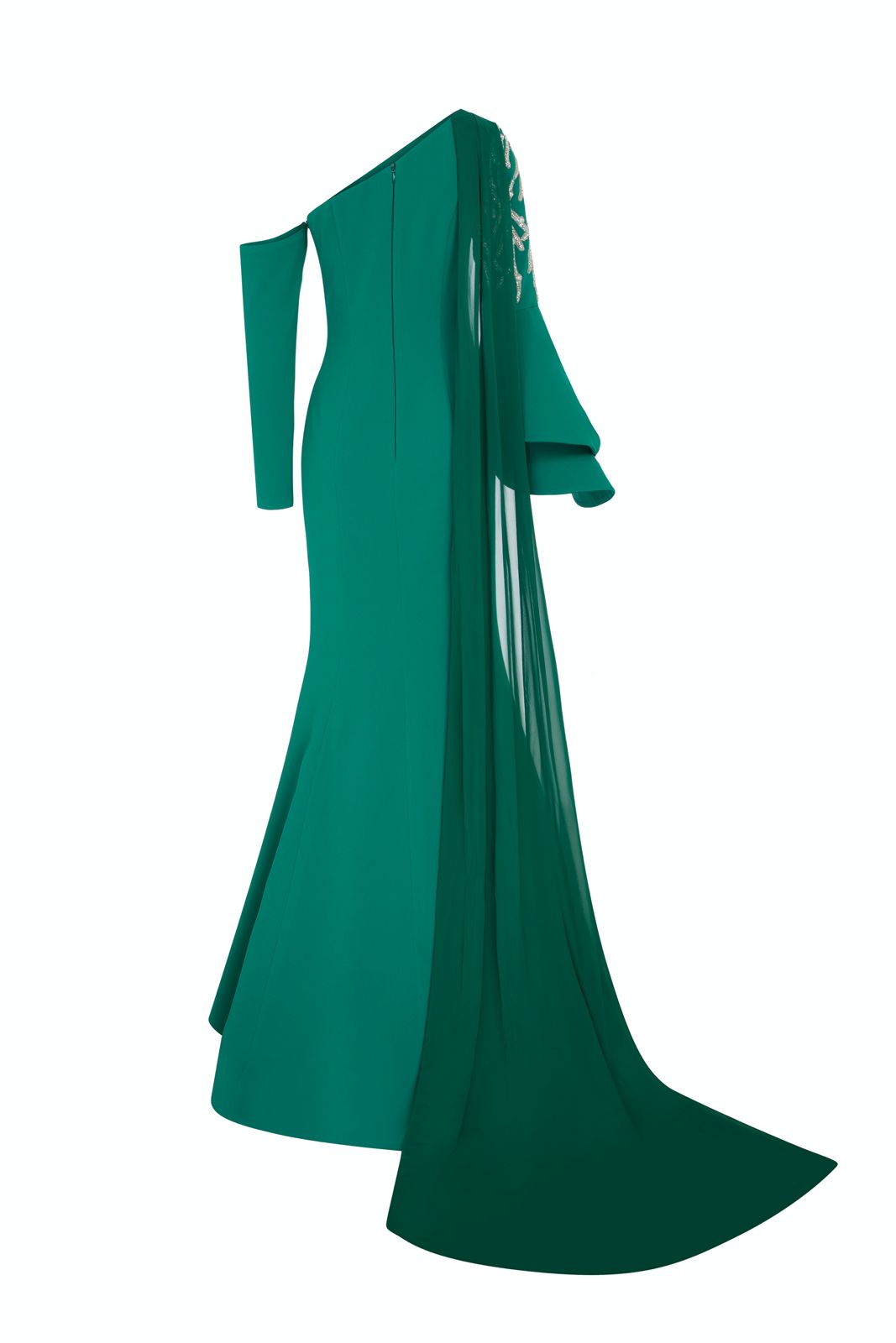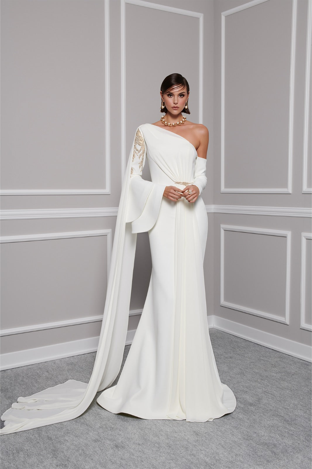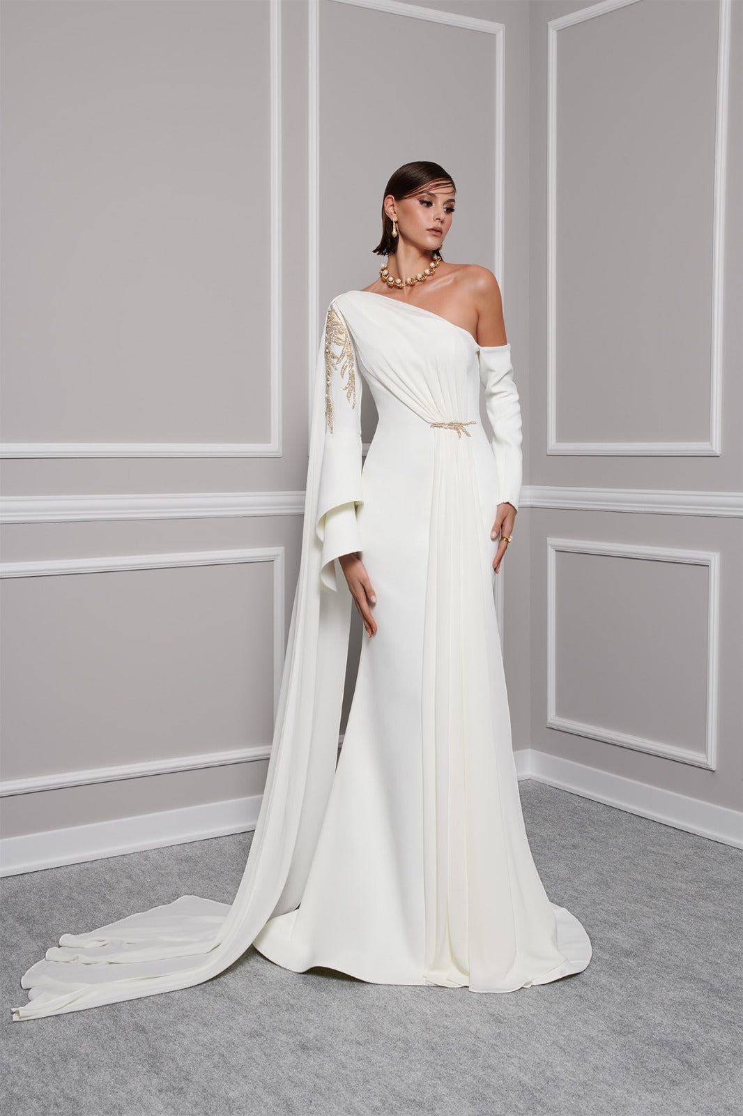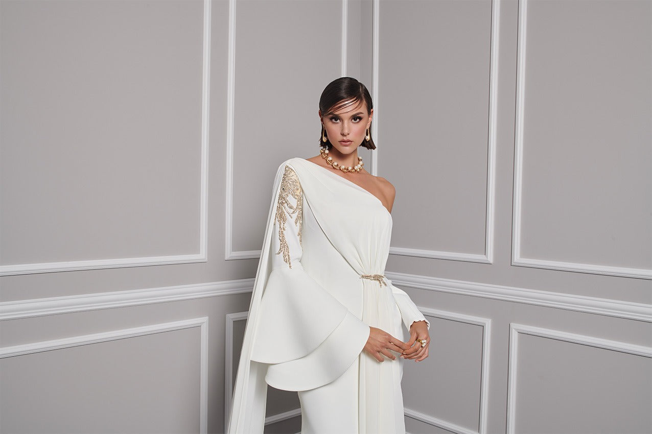 With an off-shouldered sleeve