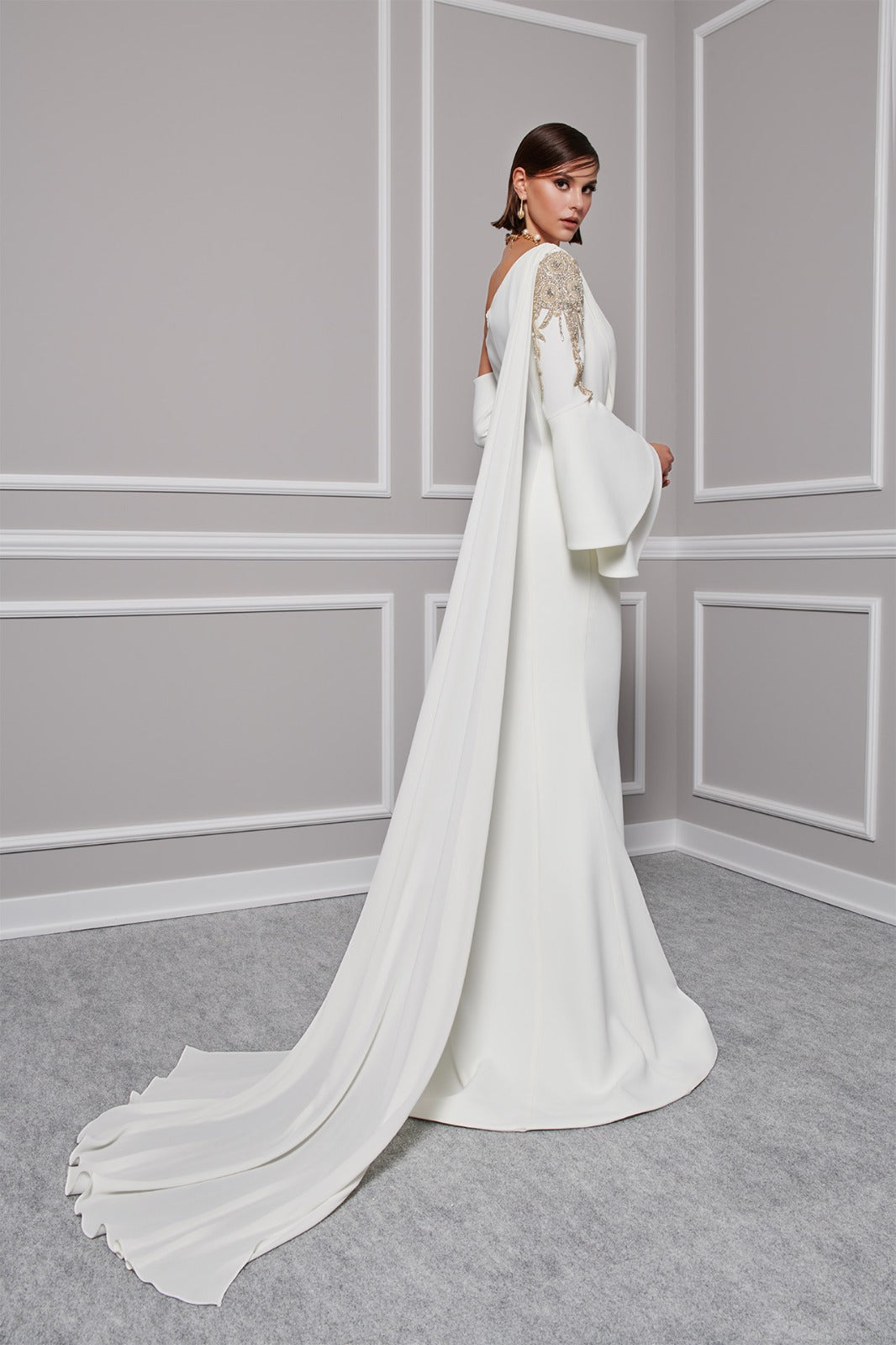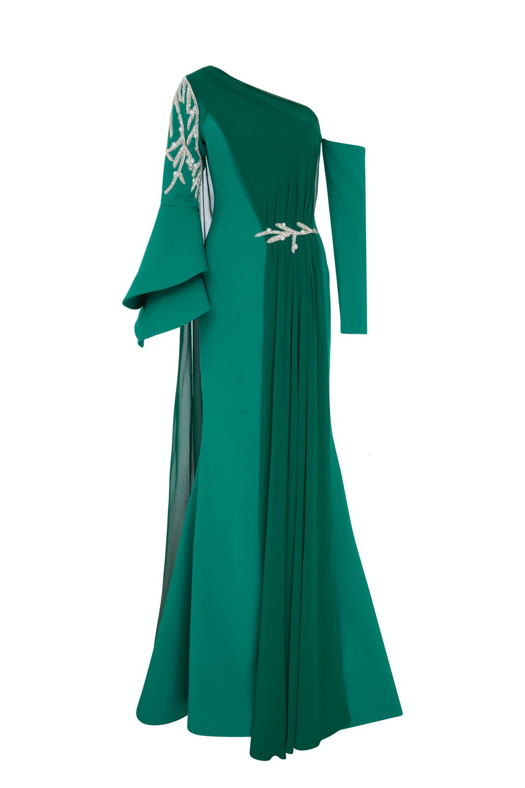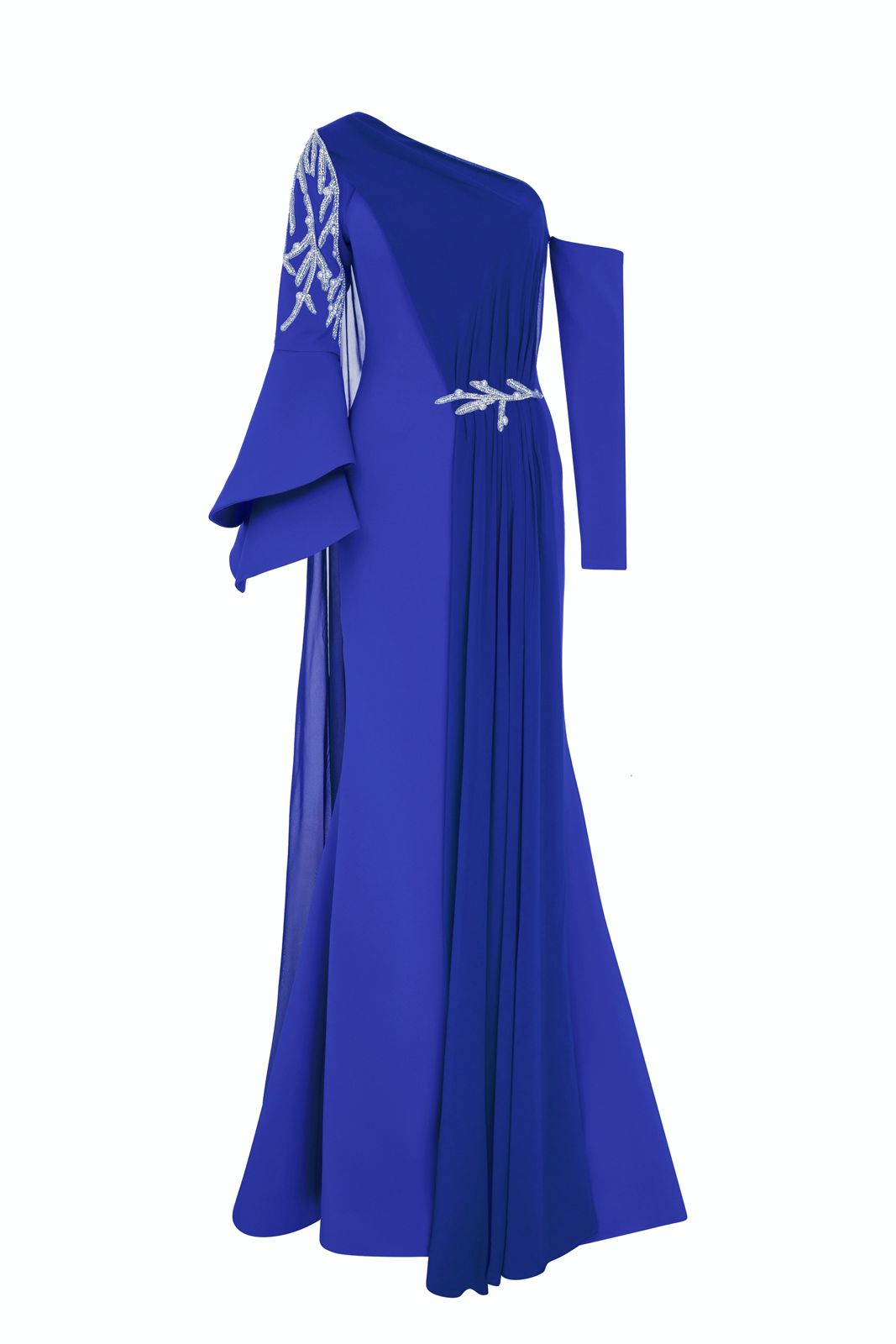 With an off-shouldered sleeve